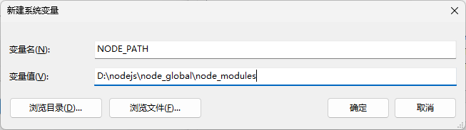 4.1系统变量 新建一个变量名为“NODE_PATH”,值为“D:\nodejs\node_global\node_modules”